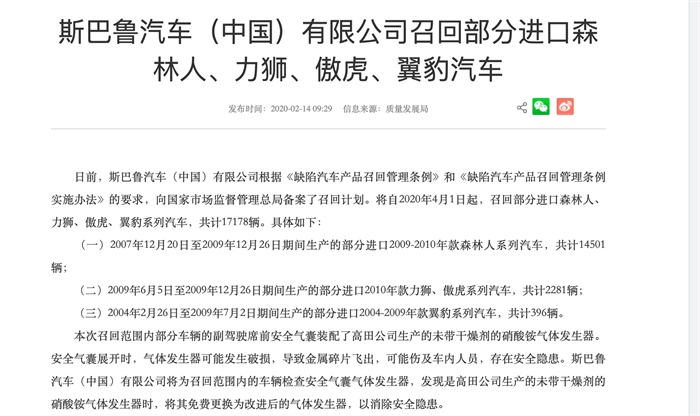 此外,斯巴鲁汽车(中国)有限公司根据《缺陷汽车产品召回管理条例》和《缺陷汽车产品召回管理条例实施办法》的要求,向国家市场监督管理总局备案了召回计划。将自2020年4月1日起,召回部分进口森林人、力狮、傲虎、翼豹系列汽车,共计17178辆。具体如下: