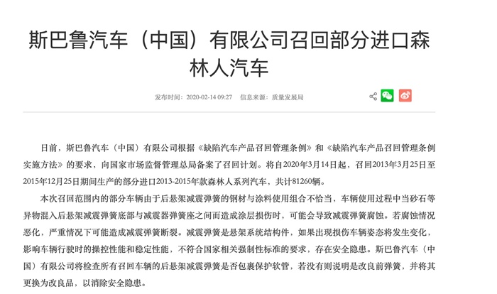 在国家市场监督管理总局的公开信息上,有两则关于斯巴鲁召回的消息。斯巴鲁汽车(中国)有限公司根据《缺陷汽车产品召回管理条例》和《缺陷汽车产品召回管理条例实施方法》的要求,向国家市场监督管理总局备案了召回计划。将自2020年3月14日起,召回2013年3月25日至2015年12月25日期间生产的部分进口2013-2015年款森林人系列汽车,共计81260辆。