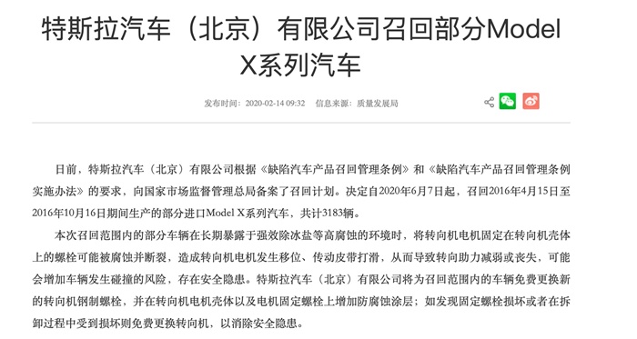此外,特斯拉在中国发起召回。2月14日,特斯拉汽车(北京)有限公司根据《缺陷汽车产品召回管理条例》和《缺陷汽车产品召回管理条例实施办法》的要求,向国家市场监督管理总局备案了召回计划。决定自2020年6月7日起,召回2016年4月15日至2016年10月16日期间生产的部分进口Model X系列汽车,共计3183辆。